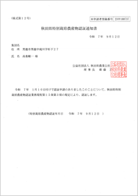 安心・安全の証として、公益社団法人秋田県農業公社より特別栽培米(農薬と化学肥料をこれまでの半分以下に抑えて栽培)の認証を受けています。